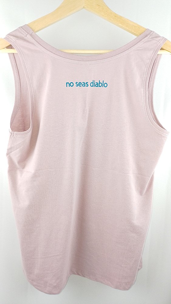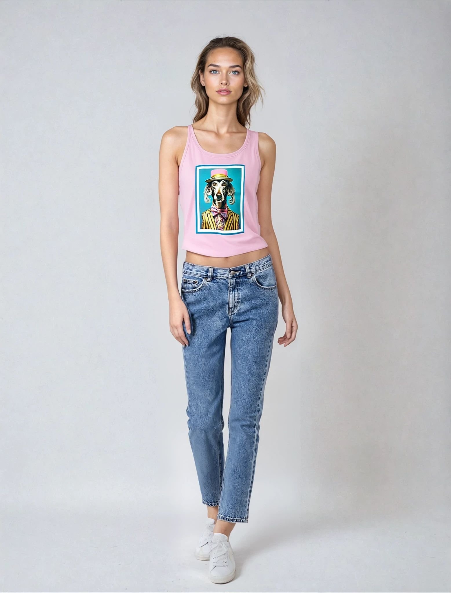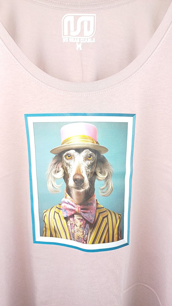 Camiseta amplia de mujer de tirante ancho color lavanda con diseño cuadro de perro con sombrero no seas diablo.