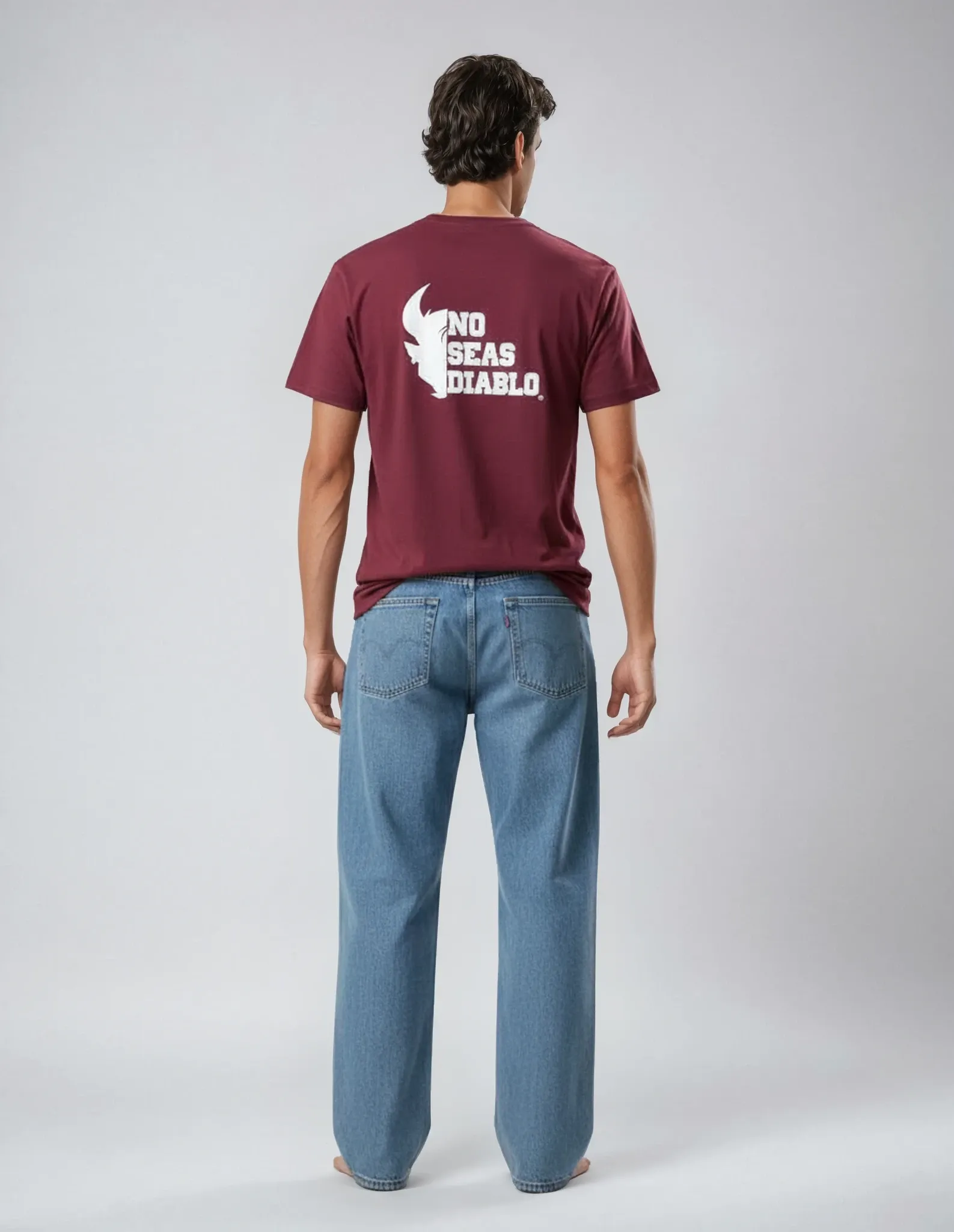 Camiseta granate con el logo de no seas diablo en la espalda y la frase en la parte delantera.