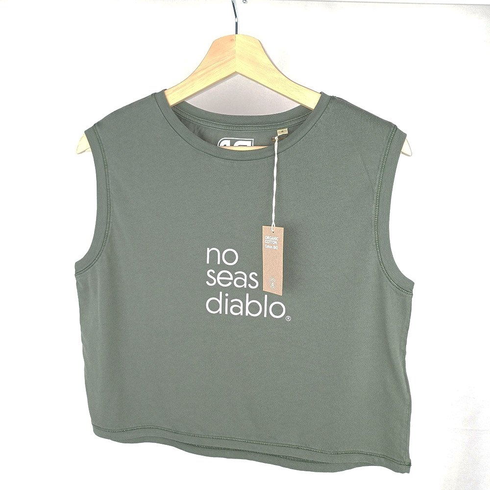 Camiseta crop ecorresponsable sin mangas «no seas diablo» en color organic khaki.