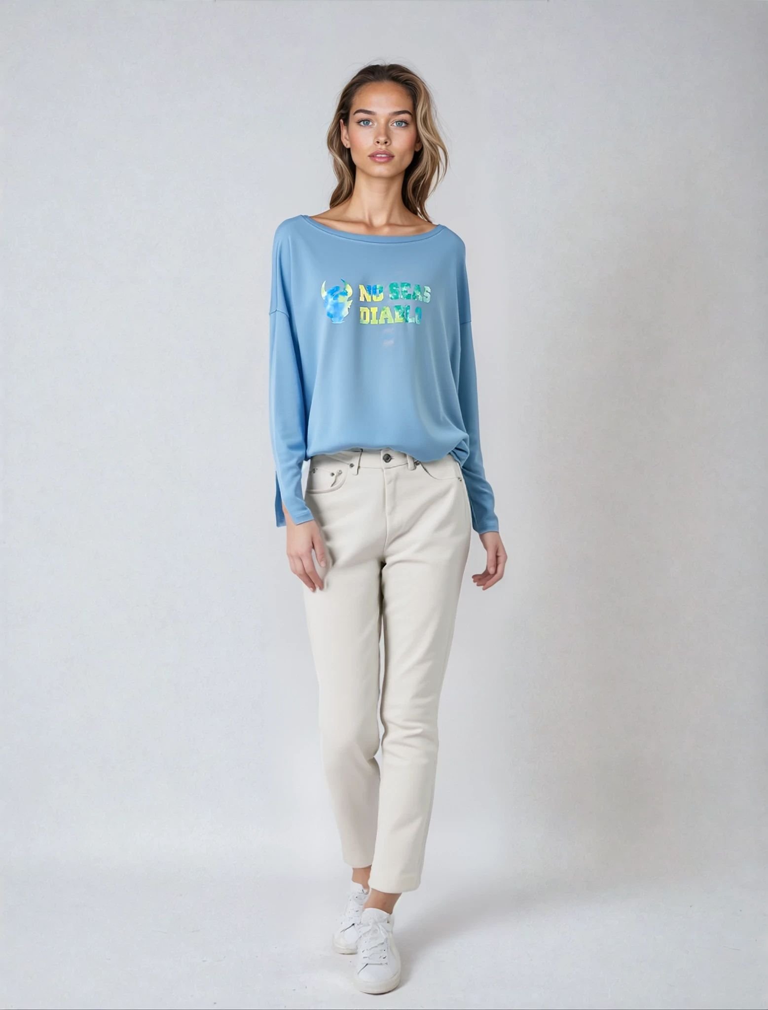 • Corte suelto y distendido con cuello amplio.